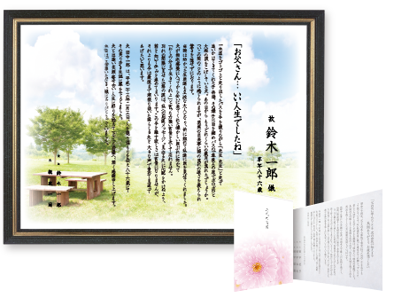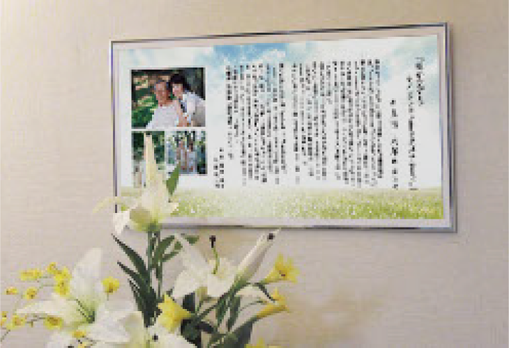会葬礼状の⽂章と季節や趣味の背景を組み合わせたパネルです。より⼿軽に思い出コーナーを演出いたします。