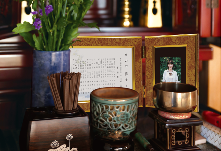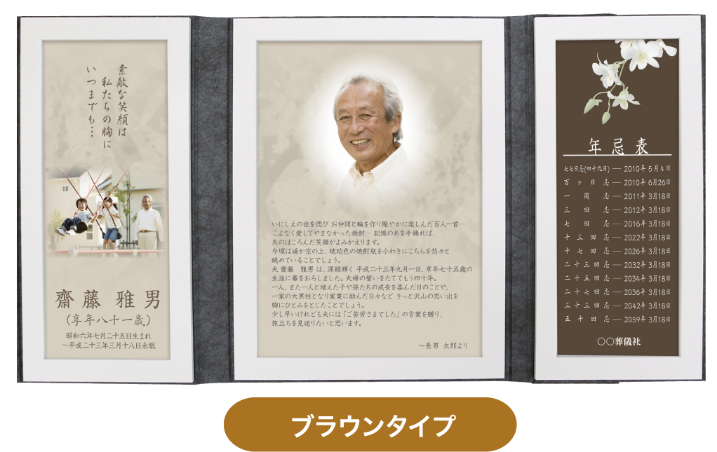 故⼈さまのお写真1点と、年忌法要のスケジュールが⼊った写真スタンドです。⾼級感のある専⽤フレームに⼊っていますので、ご⾃宅のインテリアにも違和感なくフィットします。