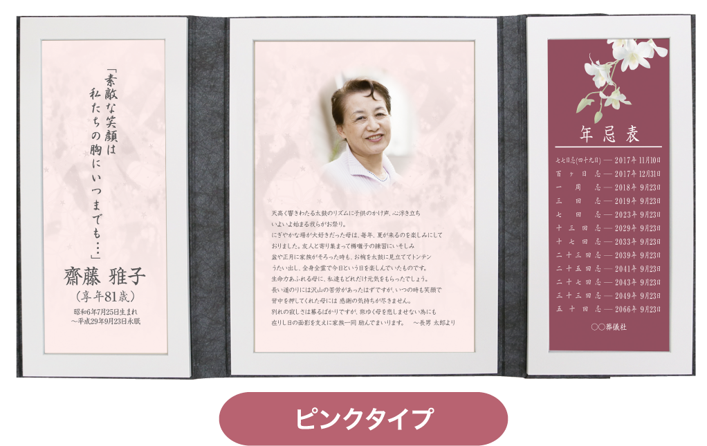 ■法戒名の有り・無し、神式への変更が可能です。■写真は1枚〜3枚まで掲載可能です。■葬儀社様との校正確認後、1週間〜10⽇で発送致します。