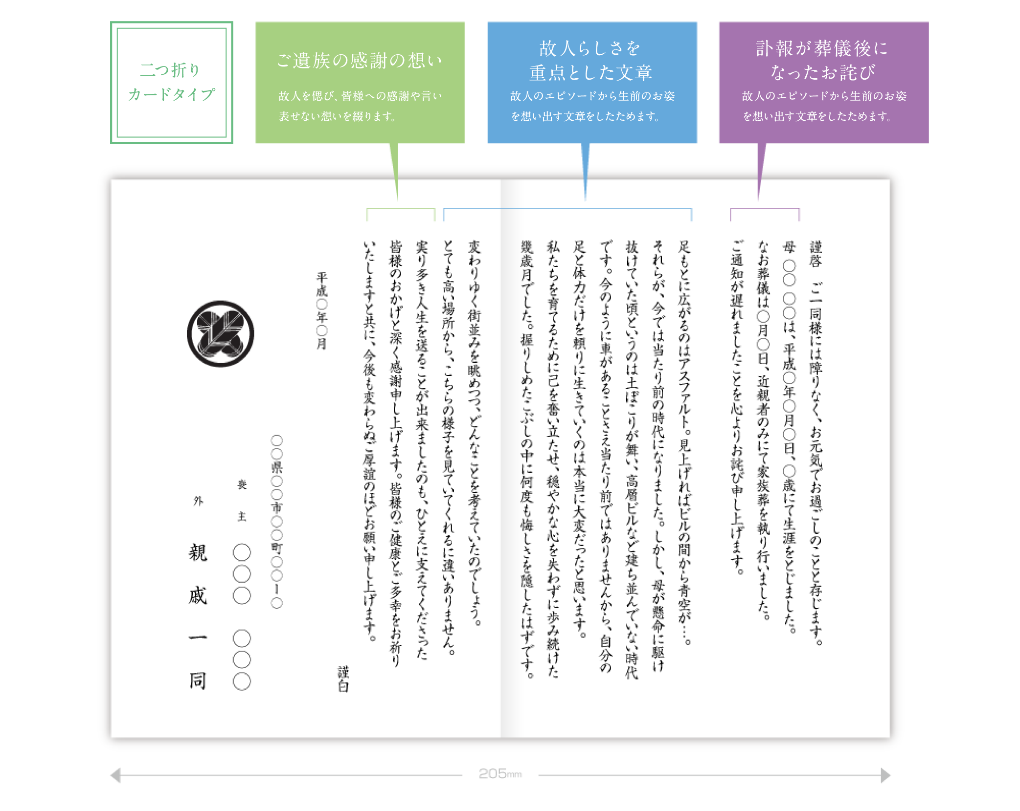 家族葬としてお身内だけで葬儀をされた場合、故人様と生前ご縁のあった方々から「なぜ知らせてくれなかった」と問い合わせがくることもしばしばです。今後のお付き合いを円滑に進めるため、お知らせが遅れたことをお詫びし、なぜ家族葬で行ったかをご理解頂き、さらには思い出のエピソードなど盛り込むことで生前のお姿を偲んで頂く…。故人様がその一生の内に培ってきた交友関係を大切にしつつ、葬儀後のご家族の負担を軽減するための新しい視点のお手紙です。