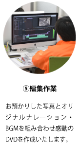 作品は一つ一つが手作りです。楽曲の抑揚やナレーションに応じた写真の配置、グラフィカルなオープニング、季節感溢れるたくさんの 素材で、納得の出来上がりをお約束します。
