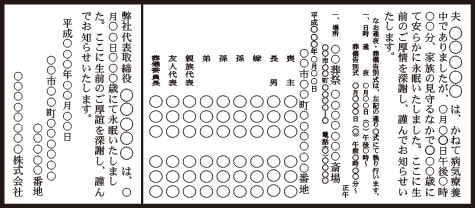 死亡・会葬の告知を⽬的とした「ご不幸新聞広告」。通常の営業広告・求⼈広告と異なり、情報を迅速に新聞紙上に掲載する広告になります。しかし、それぞれに合わせた内容とサイズを考慮しながら、原稿作成しなくてはなりせん。広告を掲載したいがどうすればよいのかわからない・・・。そんなときは、まずは弊社までご連絡下さい。広告出稿の⼿助けとなるよう、各種内容に合わせた「ご不幸新聞広告⾒本」を⽤意しました。皆様の広告イメージ把握に是⾮ともお役⽴て下さい。