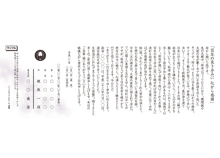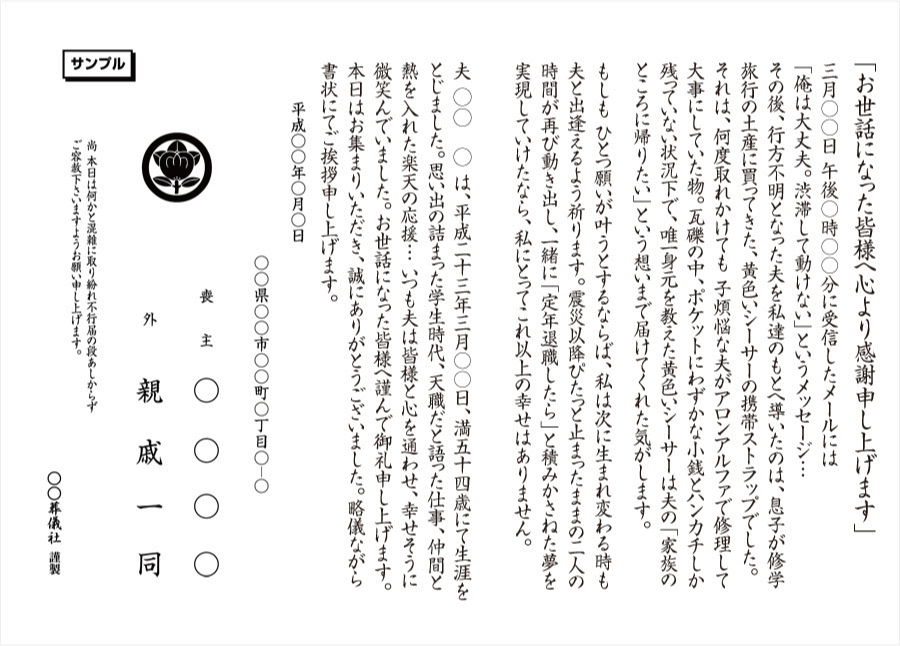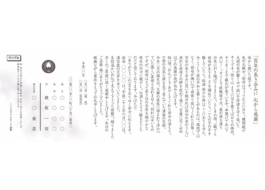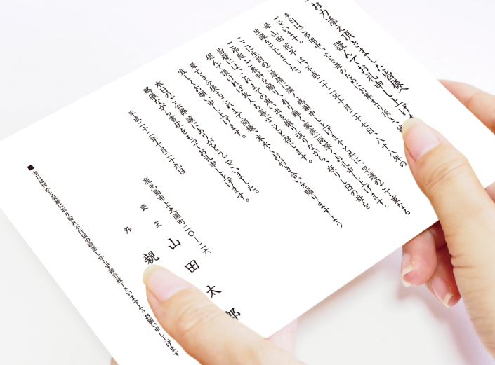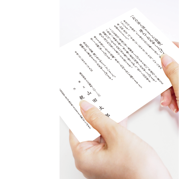 「その方の葬儀でしか出会えない、たったひとつの会葬礼状」を提案いたします。故人の生前のお人柄や、故人さまへの思いを伝える会葬礼状でありたいと考えています。