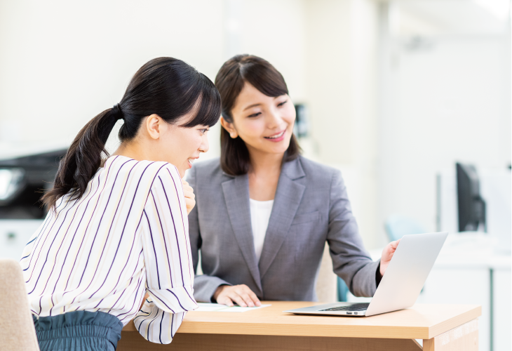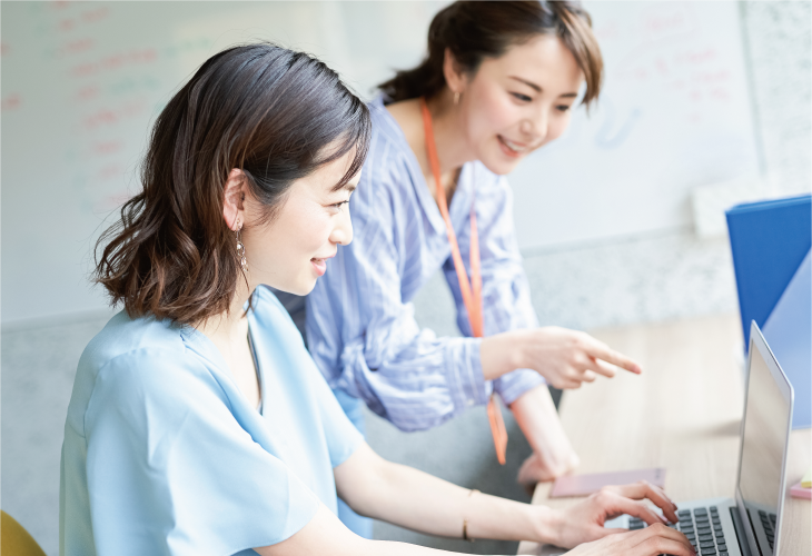 基本研修が終わると、いよいよ礼状制作に入っていきます。とはいえ最初は、不安が尽きないもの。そこで実務がスタートしてからは、ひとりの新人さんに、ひとりの先輩オペレーターがつき、マンツーマンでの指導を行っています。つまづくことがあっても先輩に質問できるので、疑問を解消しながら業務に励むことができるんです。また習熟度に応じて新たな知識をレクチャーしてもらうため、先輩と二人三脚で成長しているような実感があります。仕事のことはもちろん、時にはプライベートな話をするなど、楽しみながら学べるのも醍醐味ではないでしょうか。そばで支えてくれる人がいて、安心して働けるのも魅力です。