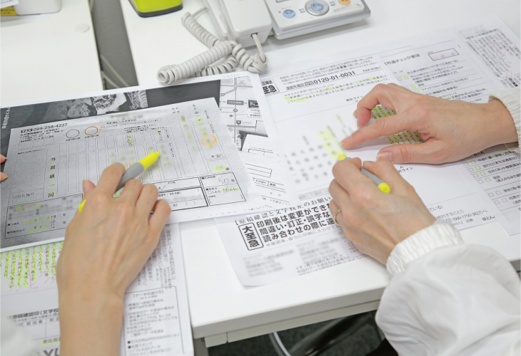 オリジナル会葬礼状を作るなら、まずは実際の文章を知るところから。という訳で、研修は校正(文章チェック)から始まります。先輩オペレーターが作成する文章を読み、実際にどんな内容が綴られているのか、雰囲気を掴むことが目的です。また弊社独自のチェックシートを用いて校正しますので、文章作成時に注意すべきポイントもおのずと見えてきます。
